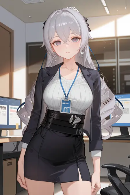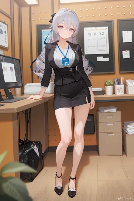 非官方女职员套装:bronya zaychik \(silverwing: n-ex\),黑色铅笔裙,黑色西装外套,工牌,条纹衬衫,高跟鞋