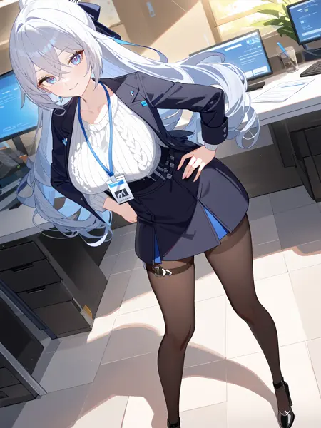 公式オフィスレディスーツ: bronya-OL2、スーツジャケット、太ももバンドストッキング、手袋、IDカード、ハイヒール、ハイウエストスカート、リブニットセーター