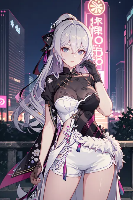 中国衣装: bronya zaychik \(heart of the night\)、ブラック片側太ももハイ、中国風ドレス、ホワイトショートパンツ、片側肘手袋、サイドキャップ、片側ハーフグローブ、ブラック片側ストッキング、ヒール