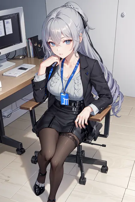 公式オフィスレディスーツ: bronya-OL2、スーツジャケット、太ももバンドストッキング、手袋、IDカード、ハイヒール、ハイウエストスカート、リブニットセーター