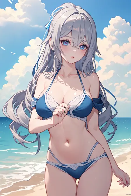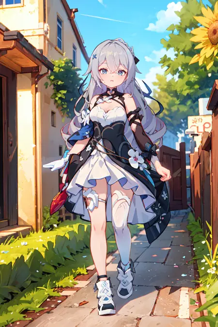 デフォルトのシルバーウィング衣装: bronya zaychik \(silverwing: n-ex\)、ホワイト片側太ももハイ、太ももポーチ、ノースリーブドレス、片側手袋、ハルターネック、片側パウルドロン、片側袖、腕ストラップ、アンクルブーツ