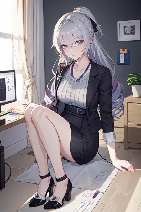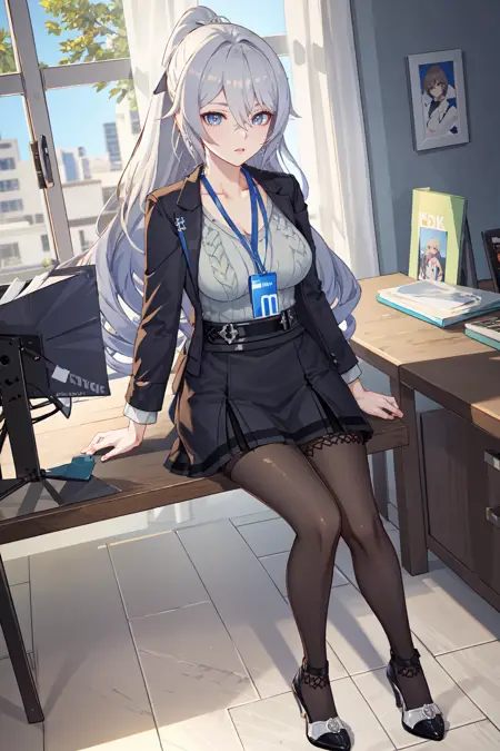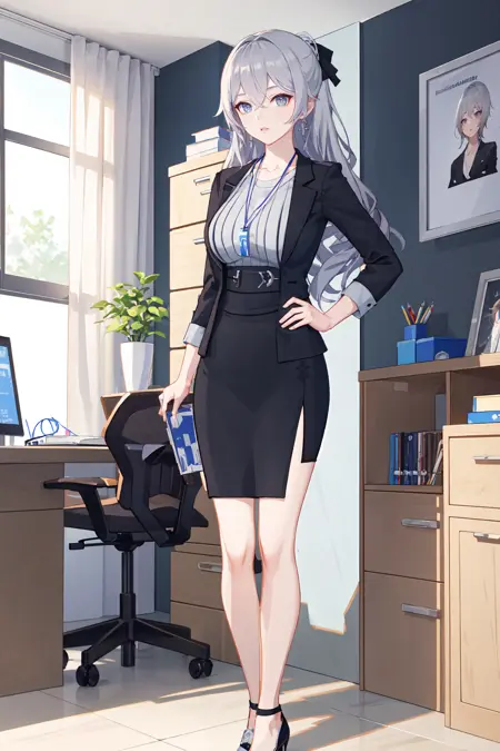 非公式オフィスレディスーツ: bronya zaychik \(silverwing: n-ex\)、ブラックペンシルスカート、ブラックブレザー、IDカード、ストライプシャツ、ハイヒール
