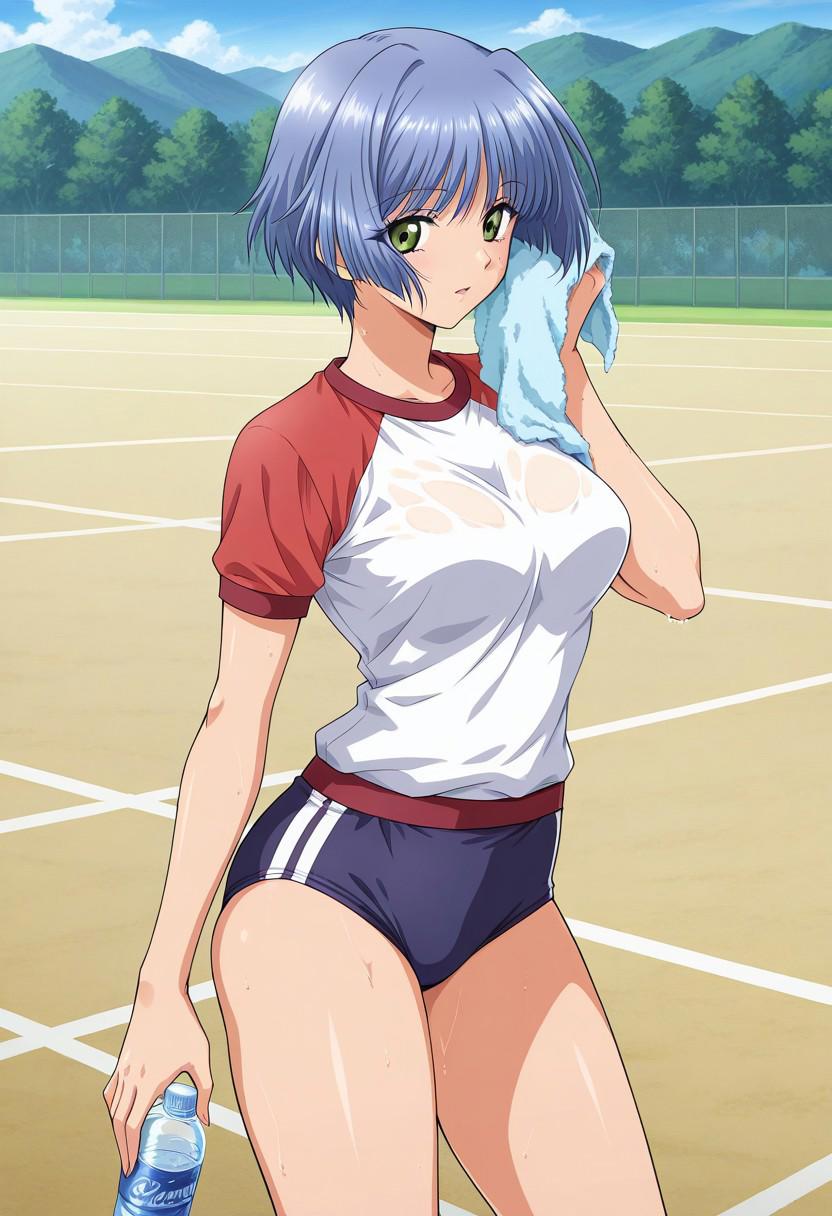 체육복, 흰색 셔츠, 라글란 소매, 빨간 라글란 소매, 짧은 소매, 부루마, 파란색 부루마