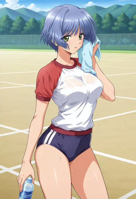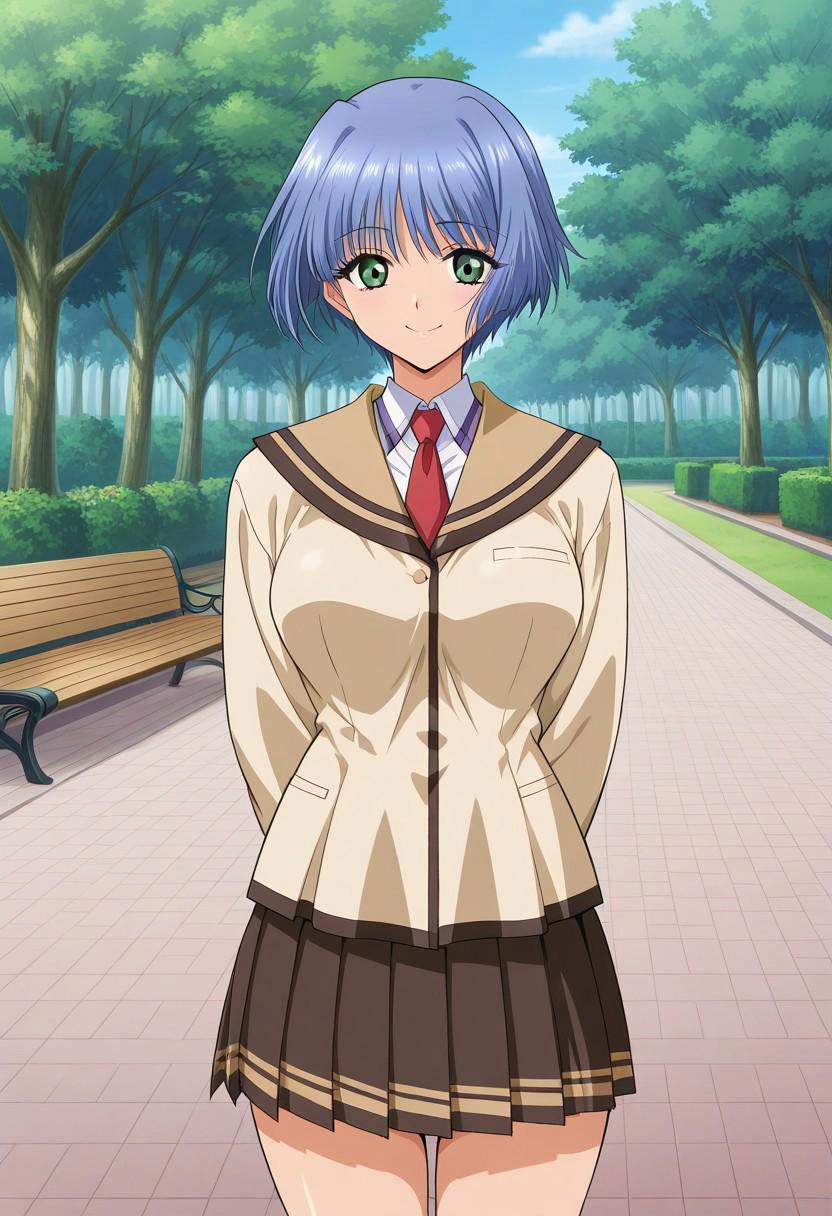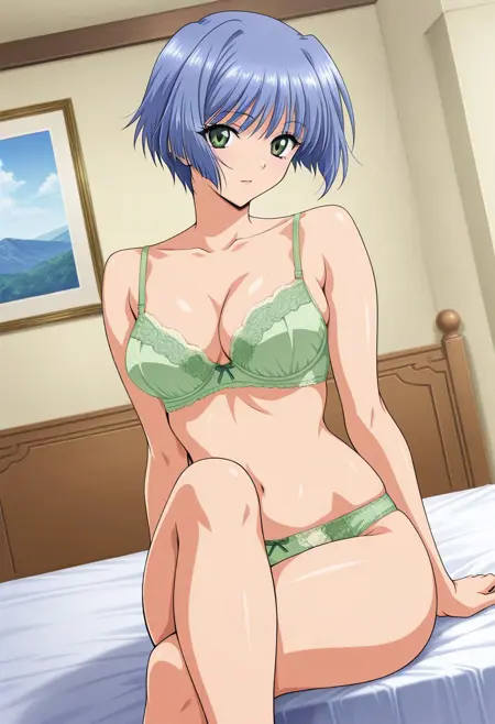키타가와 아야, 파란색 머리, 단발, 앞머리, 녹색 눈, 중간 크기의 가슴