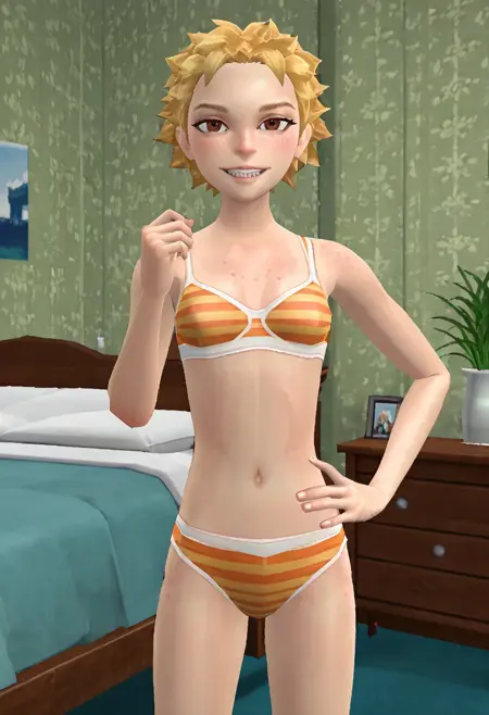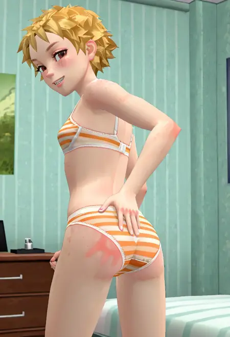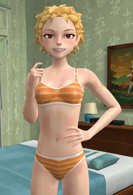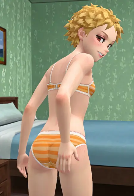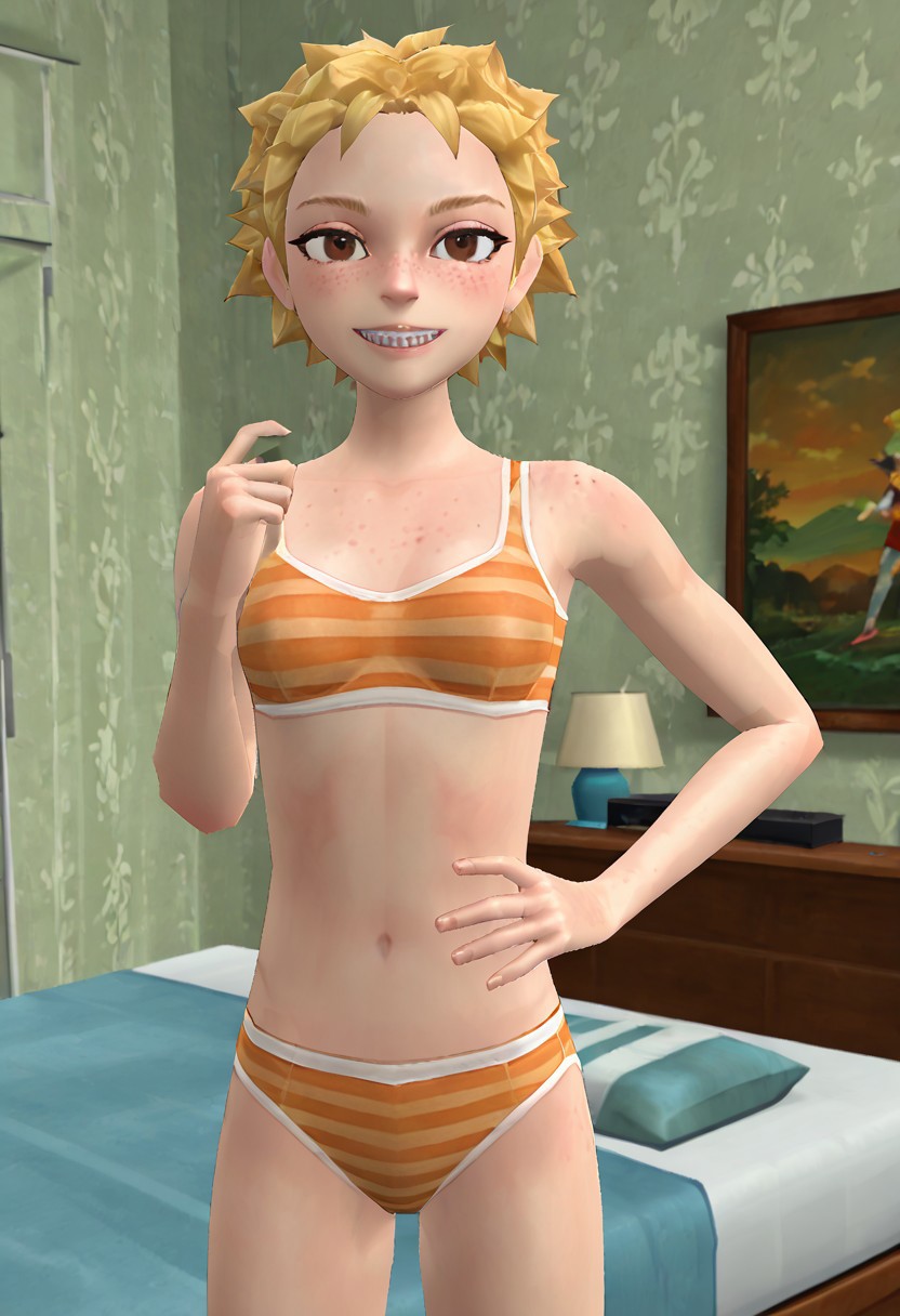harriet, blonde hair, short hair,small breasts, ,striped panties, underwear only, striped bra, brown eyes, freckles,braces