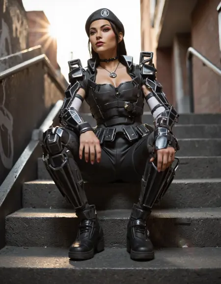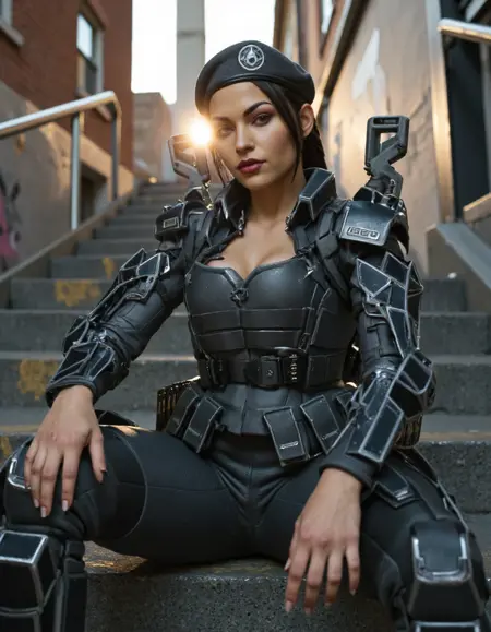 如需生成她身穿军火商皮肤的图像,请使用触发词 l0ba woman wearing futuristic military suit