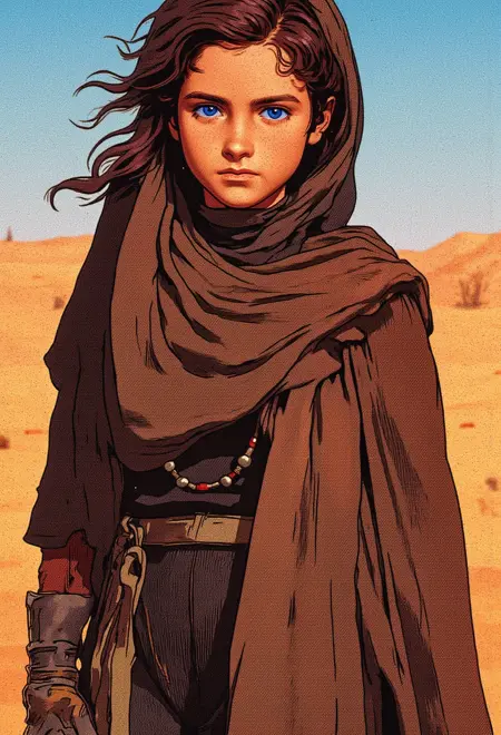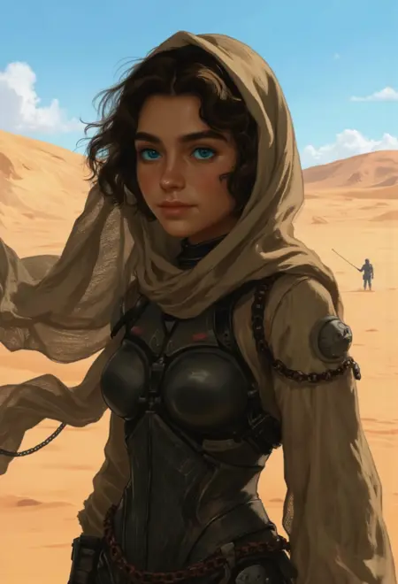 このLoRAは、『デューン』のフレメン民族に特徴的な、アイバドの目と呼ばれるブルー・ウィズイン・ブルーの目を再現します。これらの深い青い目は、香辛料メランジュに長期間さらされることで生じ、砂漠の星アラカイスとの深いつながりを象徴しています。