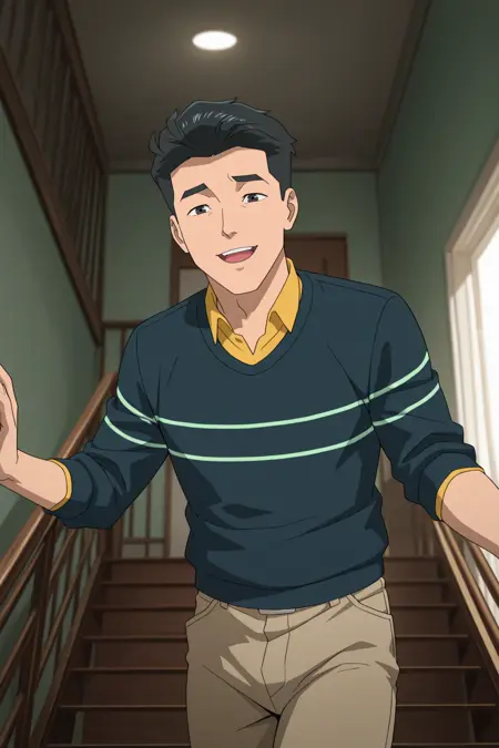 縞模様のセーター、黄色のシャツ、茶色のズボン、白い靴