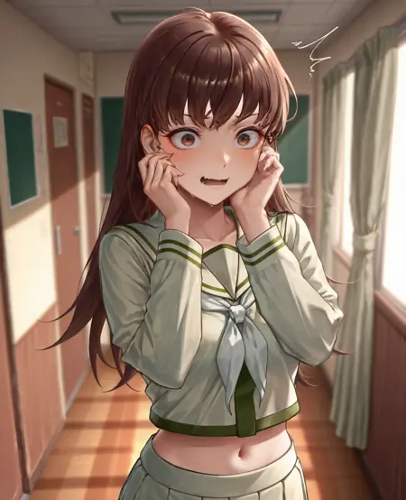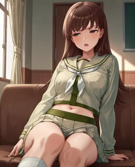 衣装: 学校制服、長袖、白いネッカチーフ、セーラー服、プリーツスカート、へそ、靴下、太ももストラップ