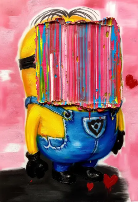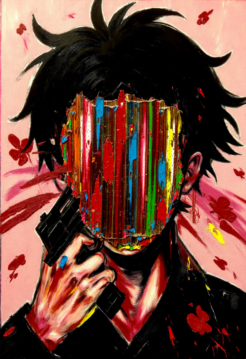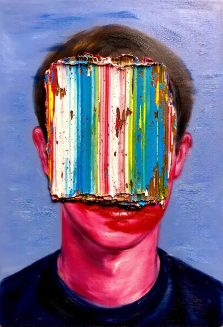 一幅生动的抽象表现主义绘画,描绘了**(主体)的超现实风格肖像,面部被一片鲜艳的多色颜料斑块遮盖,包含大胆的(颜色)、(颜色)和(颜色)**色条,形成混乱而旋涡般的视觉效果。