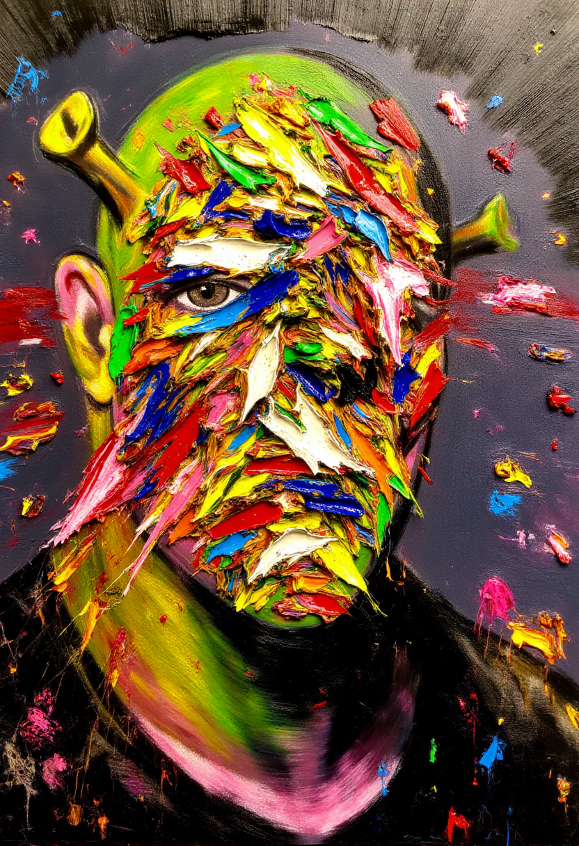 一幅以表现主义、印象派风格绘制的**(主体)**的生动抽象画。主体的面部由明亮且相互冲突的色彩混乱交织,呈现出近乎迷幻的效果。
