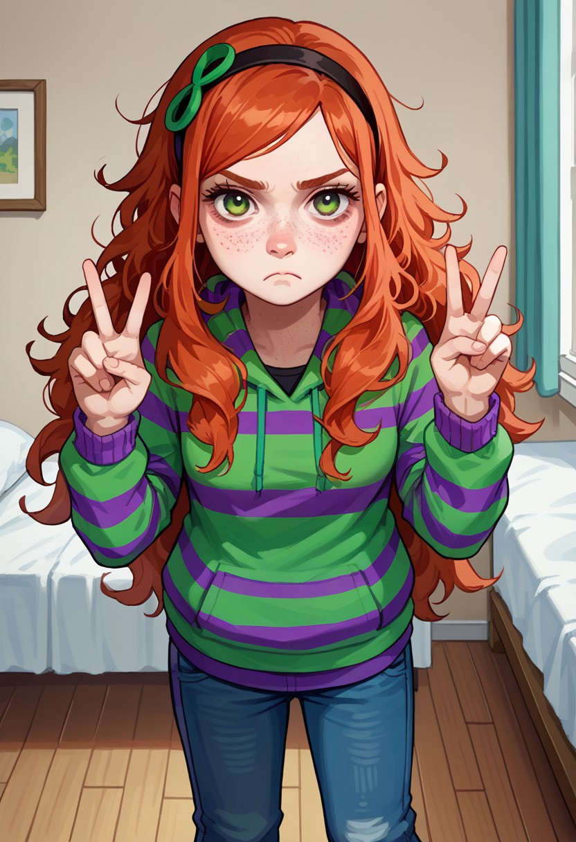主要特征: ViviJa,绿色眼睛,红色长发,凌乱的头发,不对称刘海,分岔刘海,侧发,雀斑,眼下有黑眼圈,