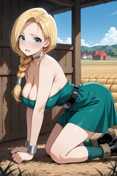 트리거 단어는 "bncad5"이며, "금발 머리, 단일 땋은 머리, 어깨에 걸친 머리, 긴 머리, 파란 눈"이 필수입니다.