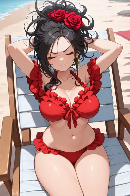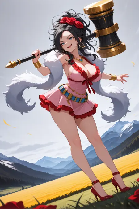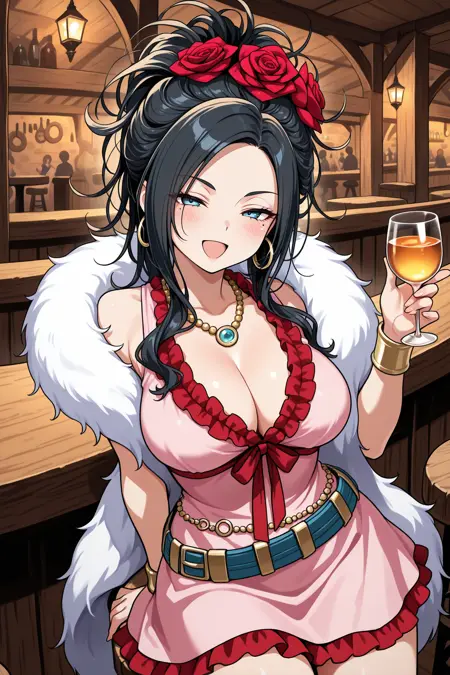 • 添加 "发饰玫瑰、发饰花朵、耳环、项链、粉色连衣裙、短裙、无袖连衣裙、荷叶边连衣裙、胸部暴露、红色丝带、羽毛围巾、腰带、手镯、高跟鞋、红色鞋子" 以呈现她的典型外观。
