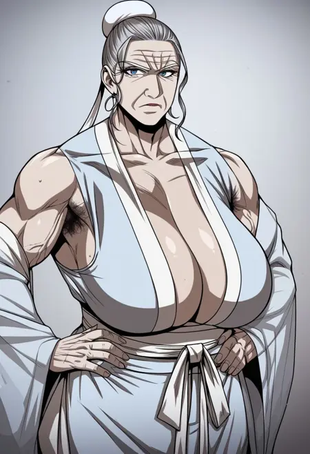 프롬프트: Gam Rosu, 1girl, old woman, muscular female, huge breasts, grey hair, blue eyes, hair bun, single hair bun, bun cover, Japanese clothes