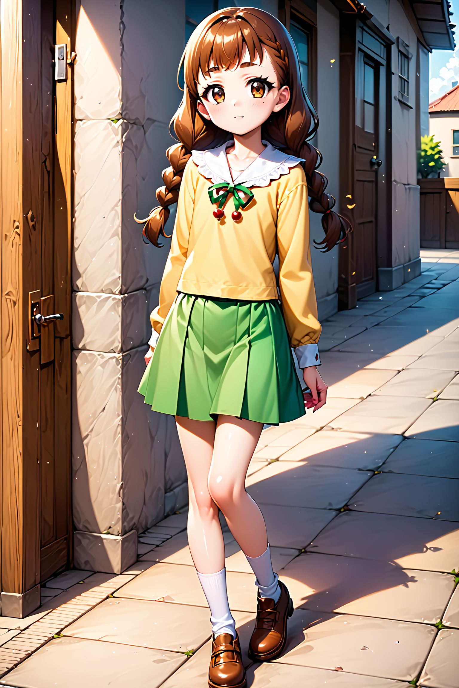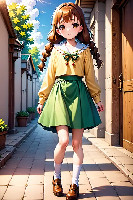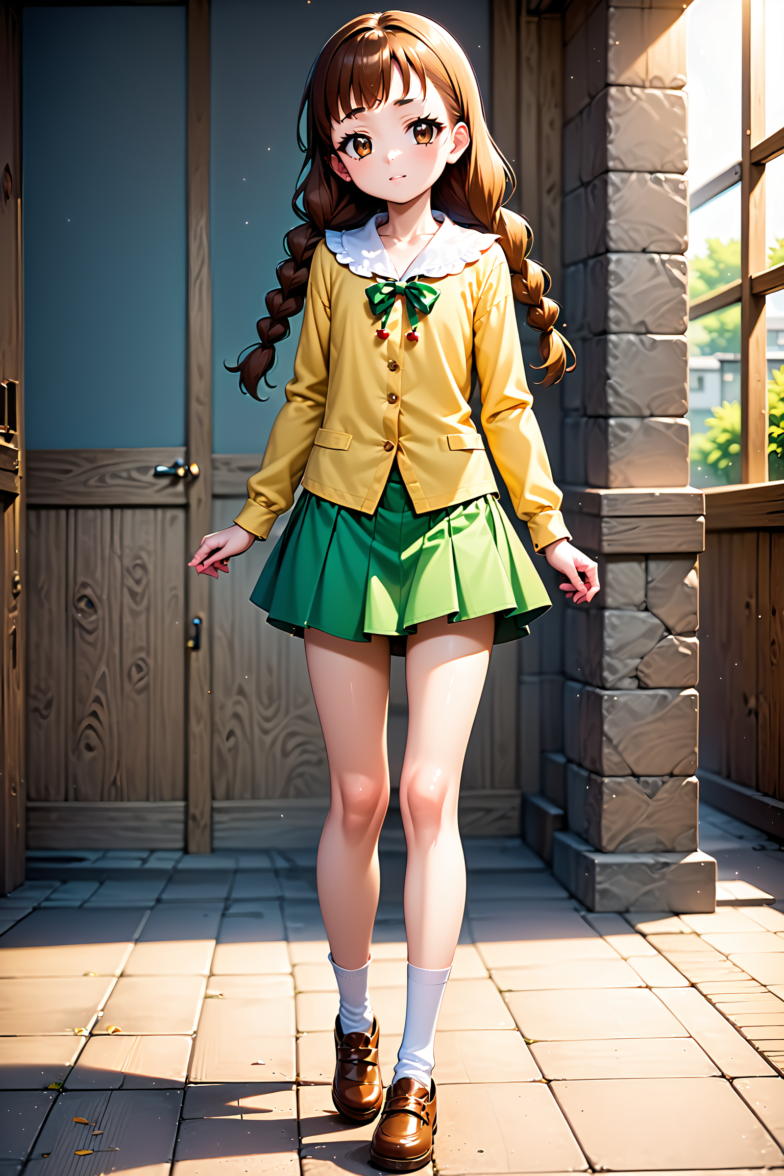 himari, 1girl, バレンタイン, スカート, ソロ, 茶色の髪, 緑のスカート, 長い髪, ツインビーズ, 茶色の目, 黄色のシャツ, フルボディ, シャツ, 長袖, 茶色の靴, 視聴者を見つめる, ソックス,