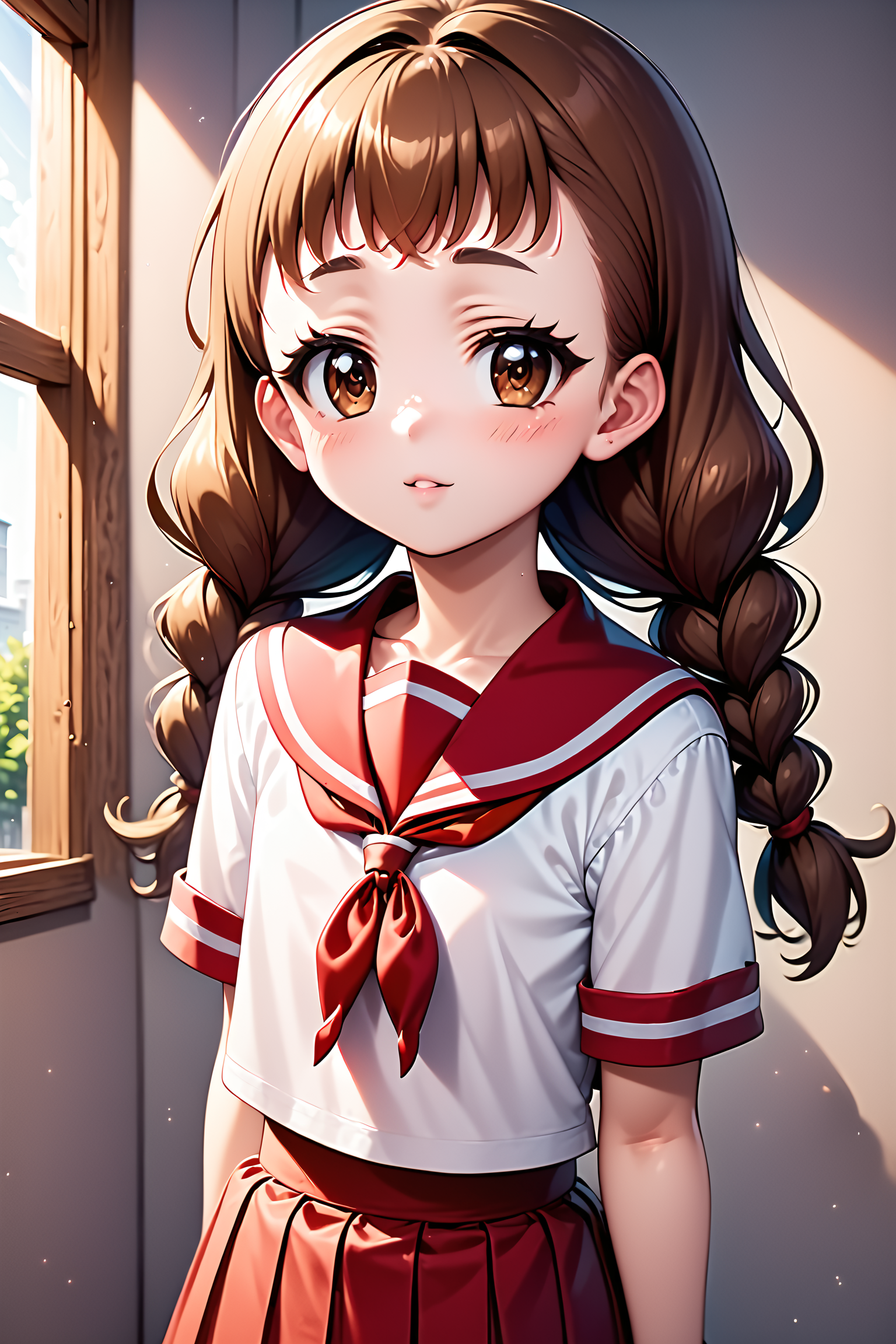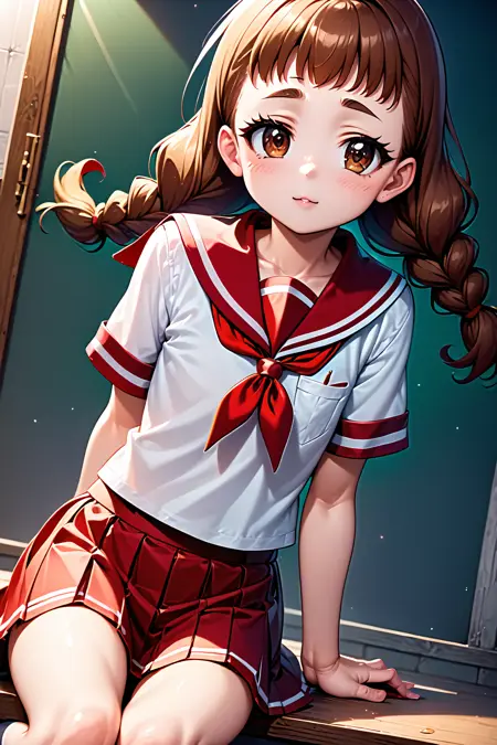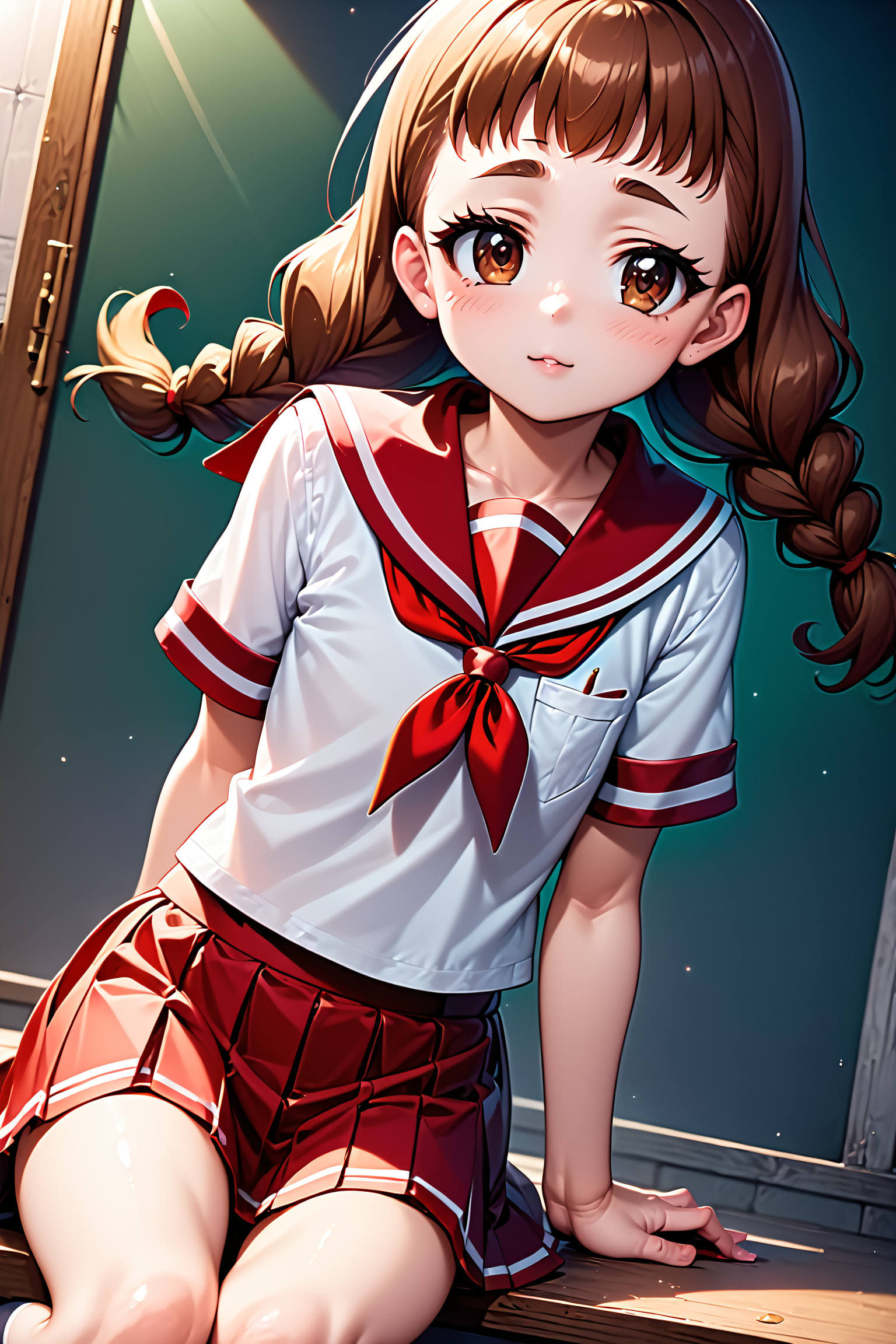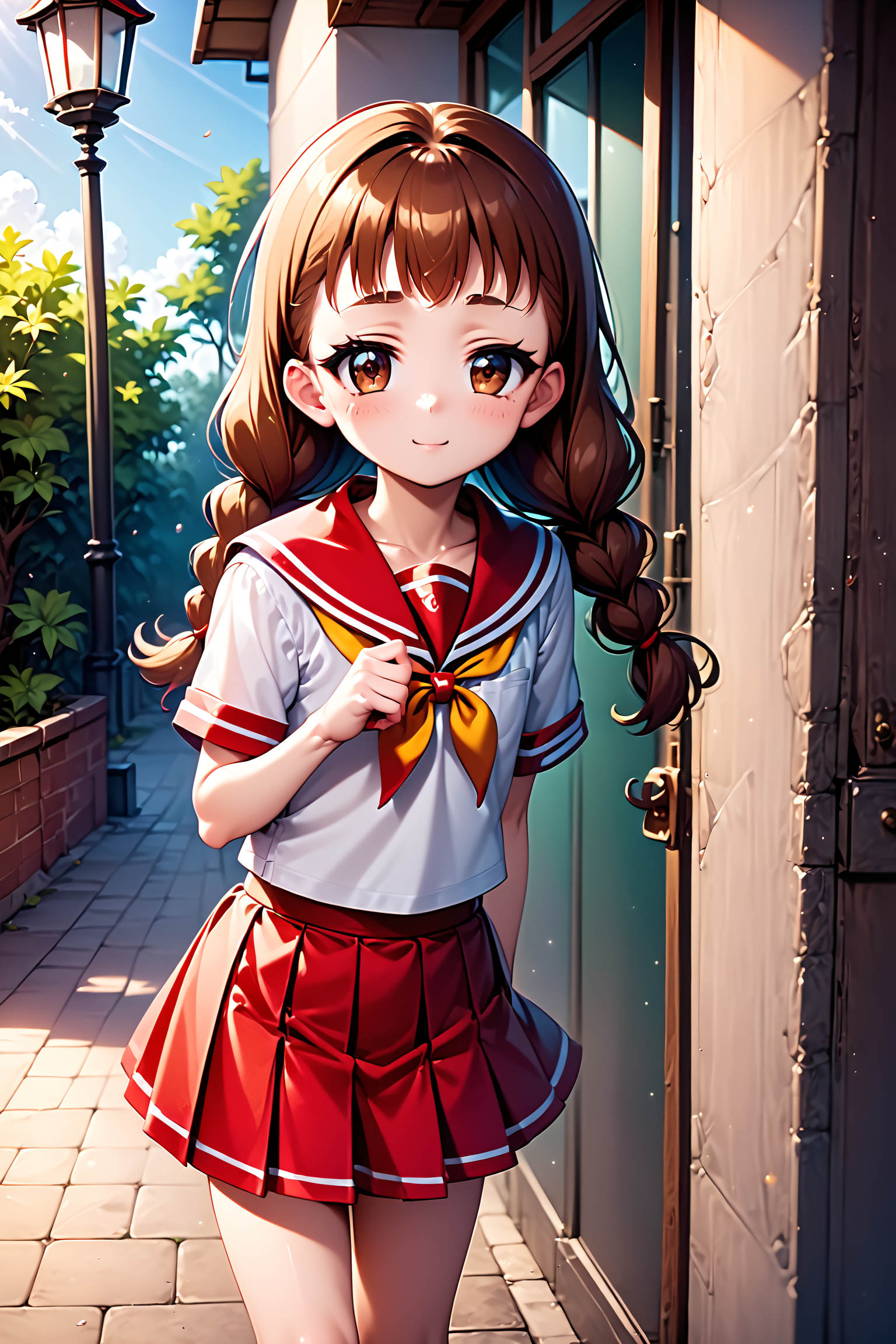 himari, 1girl, 学校制服, 茶色の髪, ソロ, バレンタイン, 茶色の目, スカート, serafuku, ツインビーズ, セーラー collar, 赤いスカート, 長い髪, 赤いセーラー collar, 視聴者を見つめる,