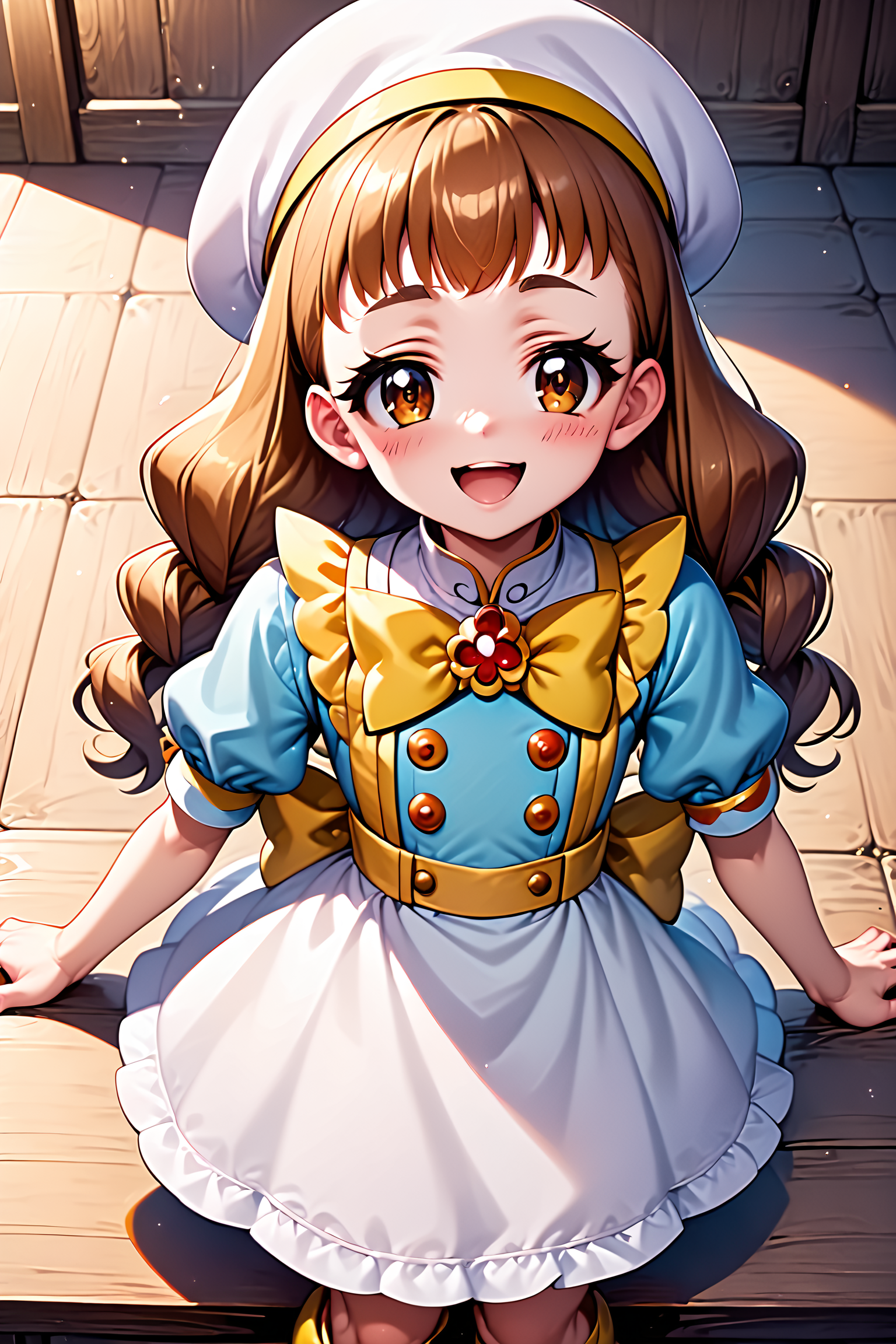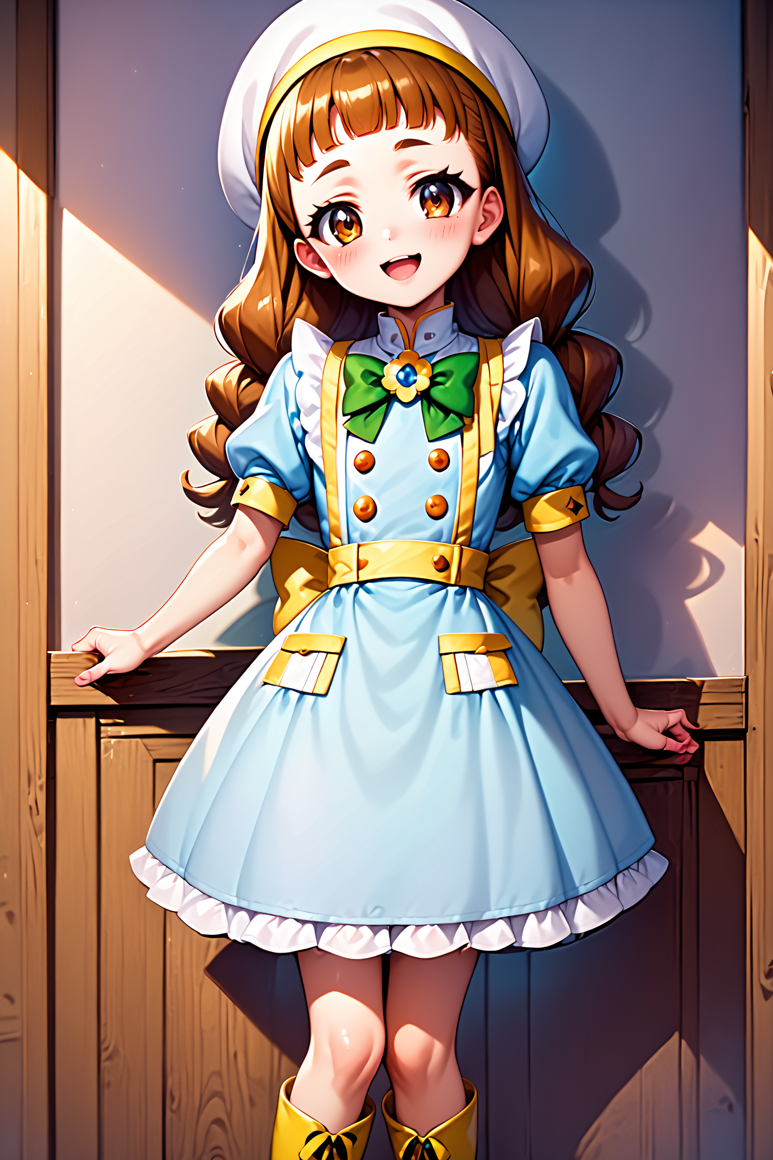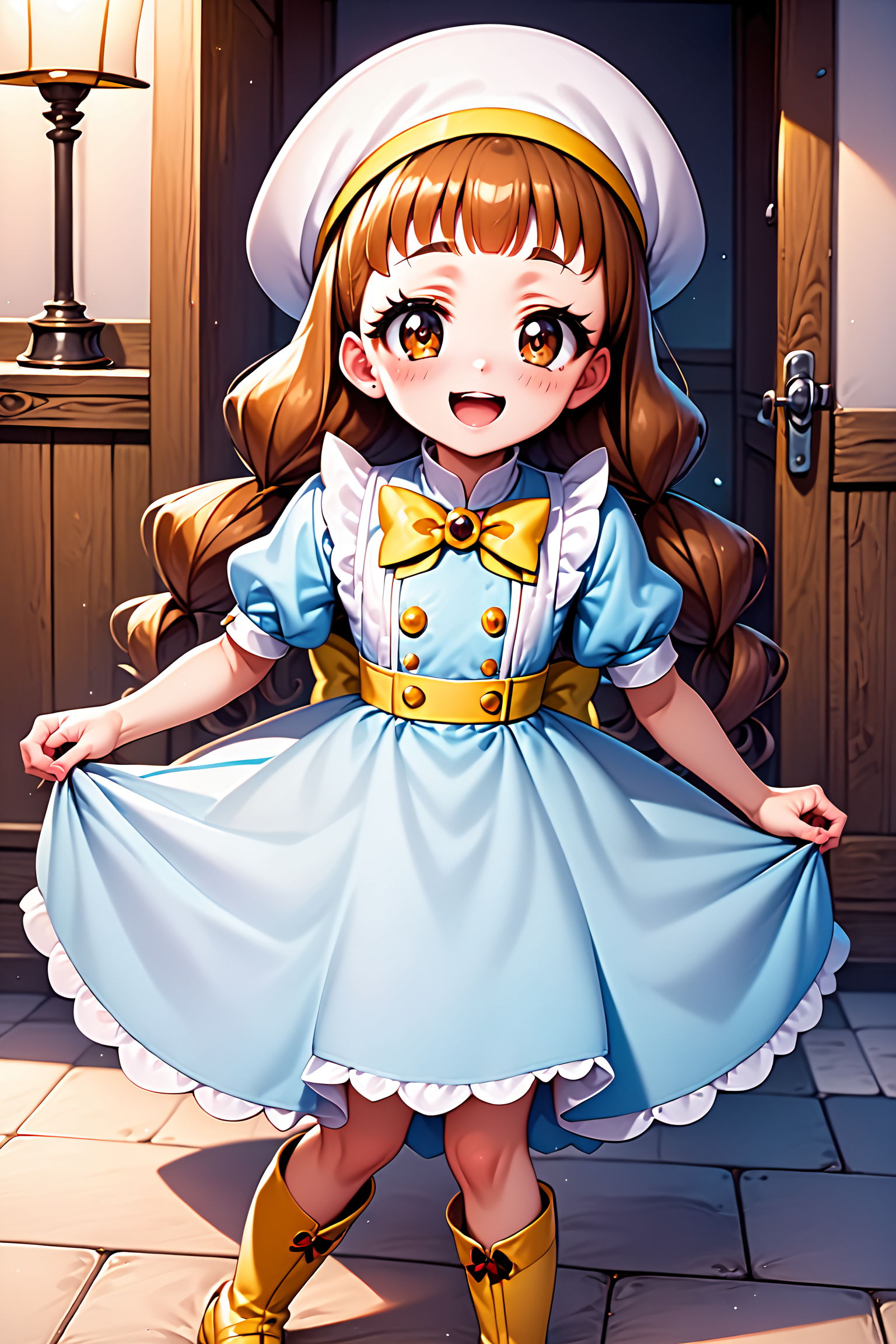 himari, 1girl, ソロ, 茶色の髪, 笑顔, 口を開ける, 帽子, 長い髪, 視聴者を見つめる, :d, 茶色の目, ほてり, ボウタイ, 白い頭部装飾, ドレス, 黄色いボウタイ, 短い袖, 水色のドレス, 黄色いブーツ,