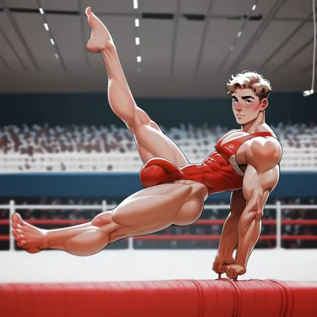 Gymnast in motion, on a pommel horse, balance beam or gym mat.