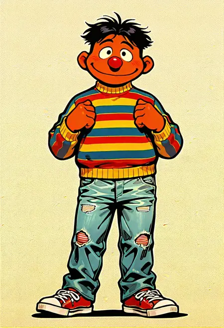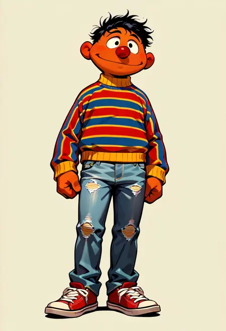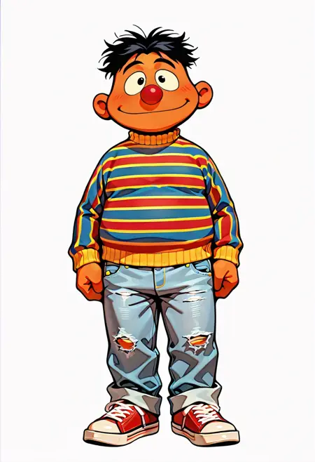 ErnieSS, 1boy, orange skin, black hair, colorful striped sweater with yellow blue and red stripes, blue jeans, red shoes, black eyes, red nose,