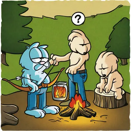 これは「ガーフィールド風」の高品質な画像を提供するためのものであり、ナルマルの要素もわずかに取り入れていますが、ガーフィールドだけではなく、人間[ジョン・アーバックル]、犬、ウサギ、その他のバリエーション、さらには人間化された時計まで、「ガーフィールド風に描かれた」全体をカバーしています。