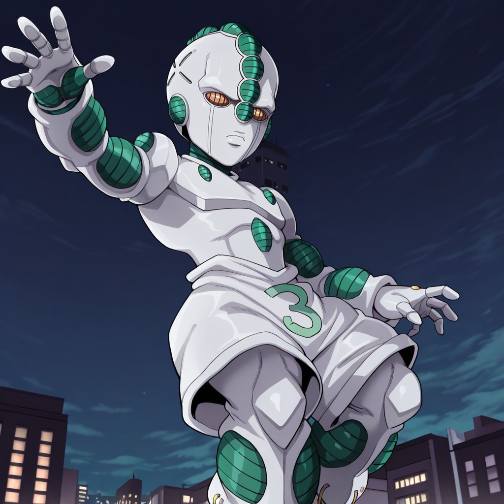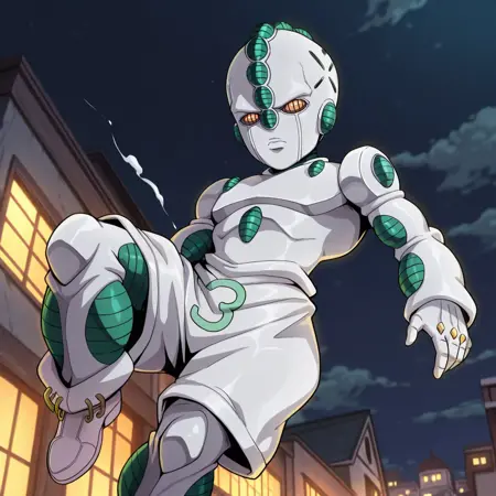male, solo, humanoid, stand (jojo), white body, green body, two-tone body, orange eyes, holes on head, back spike, white shorts, white shoes