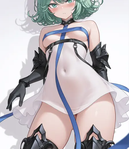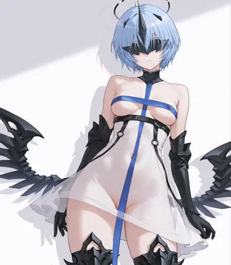 허벅지 양말, 장갑, 드레스, 어깨 노출, 부츠, 흰 드레스, 갑옷, 스트랩리스, 언더부브, 갑옷 부츠, 허벅지, 검은 장갑, 팔꿈치 장갑, 유두 가림, 반투명, 배꼽 가림, 속옷 없음, 적절한 검열, 벨트브라, 파란 리본,