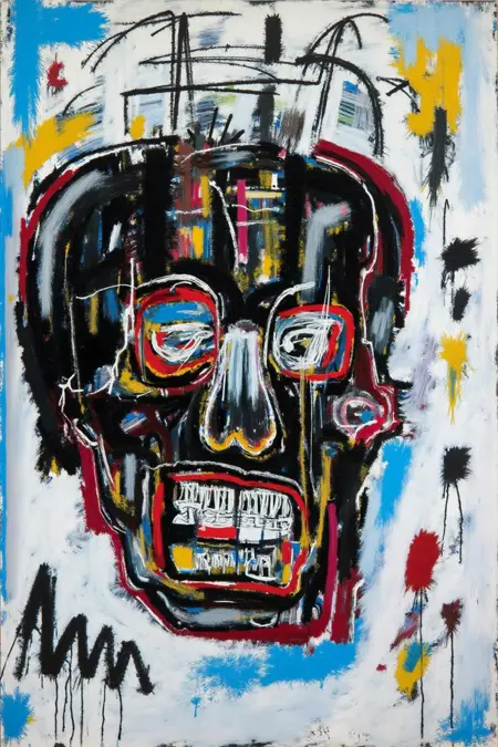 🎨 원시적이고 에너지 넘치며 층층이 쌓인 – 바스키아의 회화는 일반적으로 다음 요소로 가득 차 있습니다: