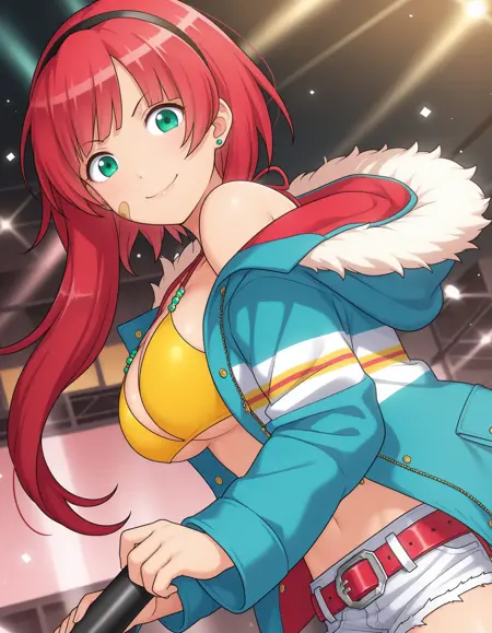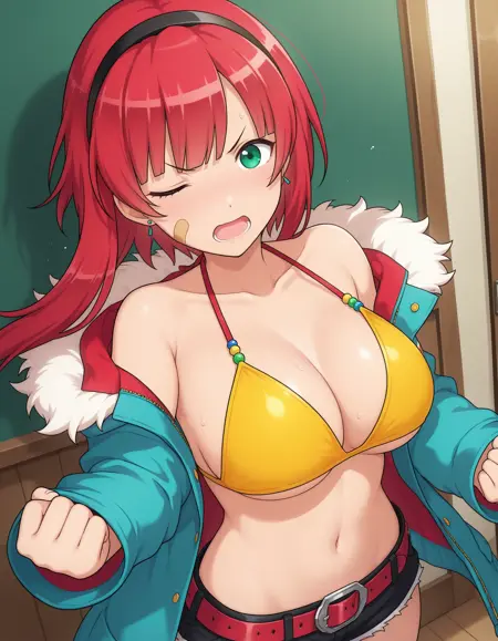 otomefestival,hazukiamane,red hair,long hair,swept asymmetrical bangs,bandaid,bandaid on face,green eyes,earrings,hairband,large breasts