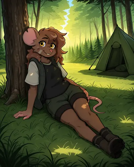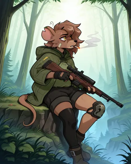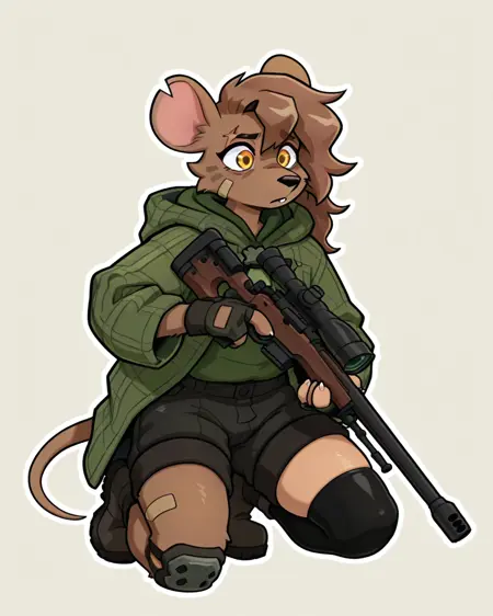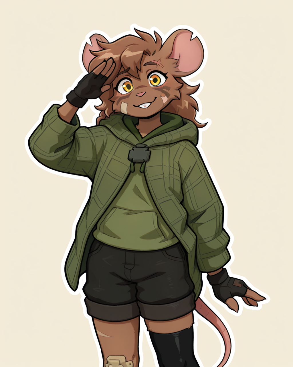 トリガー:女性、マウス、黄色い目、顔の傷跡、顔の絆創膏、切り欠きのある耳、顔のペイント、茶色い髪、尾、茶色い毛並み、ブーツ、黒いショートパンツ、緑のジャケット、出っ歯、片方の膝パッド、片方のスリーブレッグ、指なし手袋、カーゴショーツ、緑のフーディー、開いたジャケット