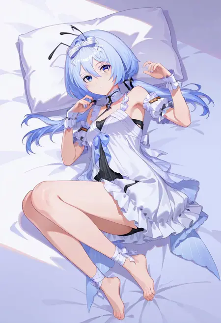 1girl, yugiri-default, 파란 눈, 앞머리, 파란 머리, 눈 사이 머리카락, 트윈테일, 안테나, 헤어밴드, 흰 드레스, 맨발