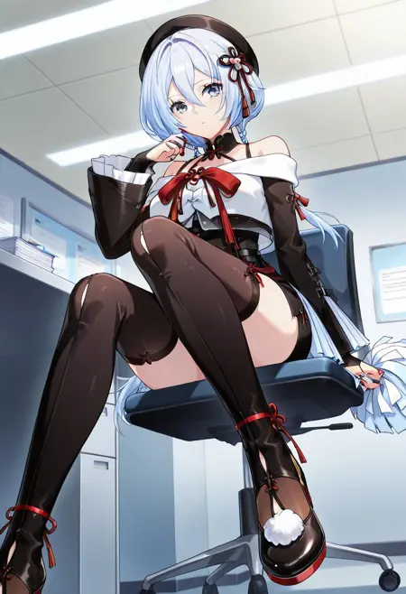 1girl, yugiri-ink-dyed-plum, 짧은 은청색 머리, 파란 눈, 빨간 리본으로 장식된 세련된 검은 베레트. 현대적이고 전통적인 요소가 혼합된 우아하고 정교한 복장. 어깨를 드러낸 흰색 상의에 검은 소매, 빨간색 활 액센트, 털 펌퐁이 있으며, 검은 미니 스커트에는 금속 질감의 디테일이 있고, 허벅지까지 오는 검은 스타킹에는 빨간 끈으로 매는 디테일과 오픈 토 하이힐이 매치됩니다.