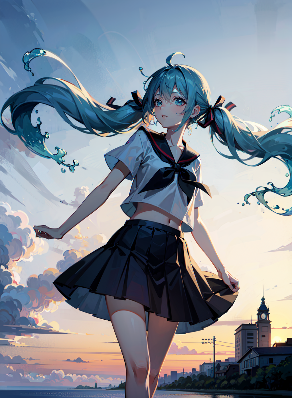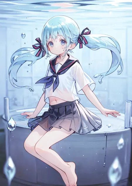 예시 프롬프트: (masterpiece:1.2), (best quality:1.4), cute quality, cowboy shot, reflection, 1girl, (bottle miku:1.2), long hair, low twintails, (liquid hair:1.3), water, goldfish, bubble, lora:Bottle\_Miku:1.2, barefoot, serafuku, hair ribbon, twintails, ribbon, fish, underwater, striped ribbon, two-tone ribbon, water, see-through silhouette, see-through, midriff, liquid, blue hair, neckerchief, black neckerchief, skirt, partially submerged, sailor collar, transparent, miniskirt, see through hair,
