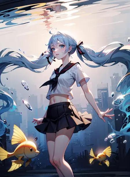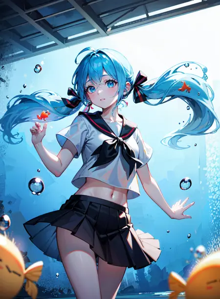 복장: 긴 머리, 맨발, 물고기, 싱글, 트윈테일, 매우 긴 머리, 볼틀 미쿠, 파란 머리, 눈 감음, 리본, 머리 리본, 세라후쿠, 물, 수중, 식물, 학교 유니폼, 스커트, 거품, 떠다니는 머리카락, 공기 방울, 액체 머리카락, 검은 스커트, 맨다리, 흰 셔츠, 아쿠아 머리카락, 빨간 리본, 단발톱, 셔츠, 잠겨 있음, 넥커치프, 전신, 앞머리, 주름 스커트, 선원 칼라, 입 닫음