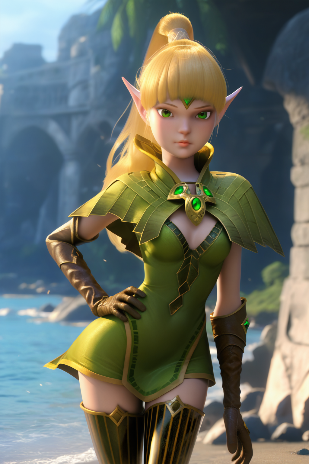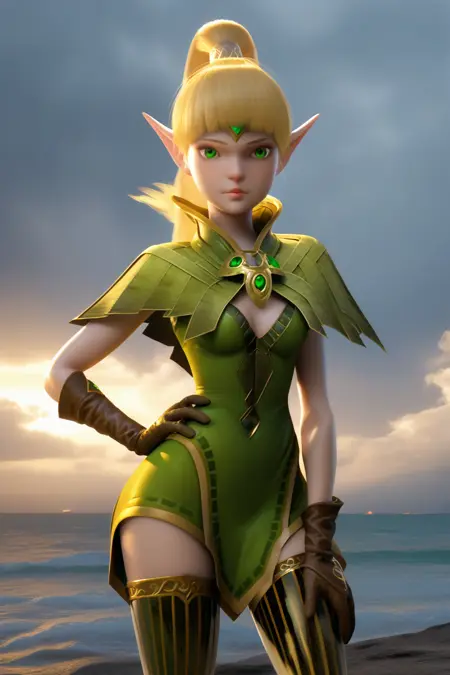 Chr_Liya, green eyes, blonde hair, pointy ears, circlet, green capelet, green dress, gloves, striped thighhighs, knee boots