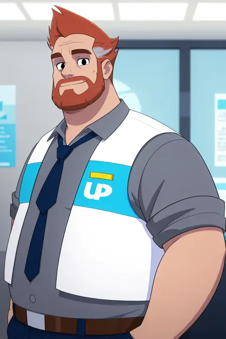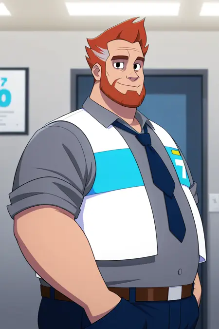 Phil Altiere, 1man, male, mature male, fat, chubby, plump, orange hair, greyhair streaks, beard, black eyes, grey collared shirt, white vest, dark blue necktie, brown belt, dark blue jeans, brown shoes,