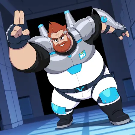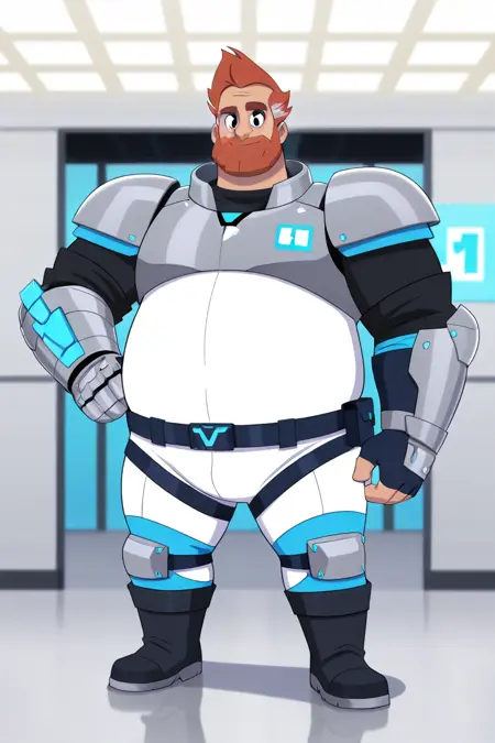 White bodysuit, grey armor, black sleeves, dark blue fingerless gloves, light blue knee pads, blue visors, black boots, silver gauntlet on right arm,