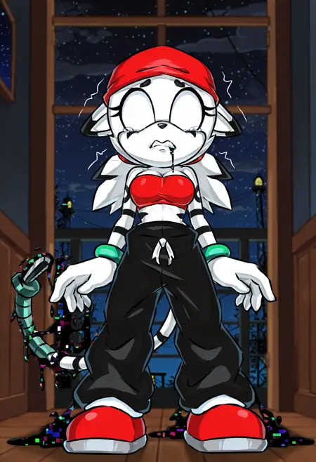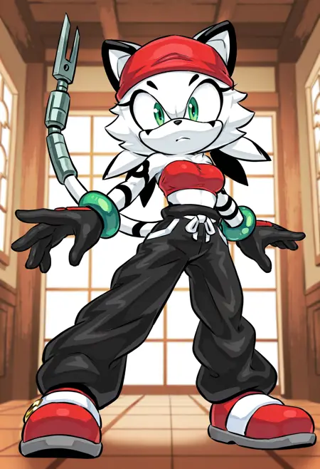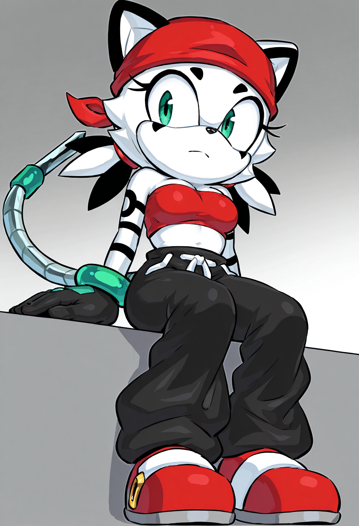 black pants, baggy pants, black gloves, red shoes, red bandeau, red bandana, green bracelets