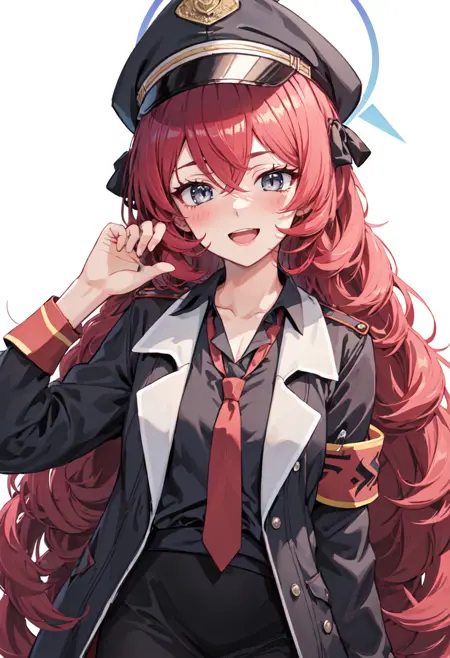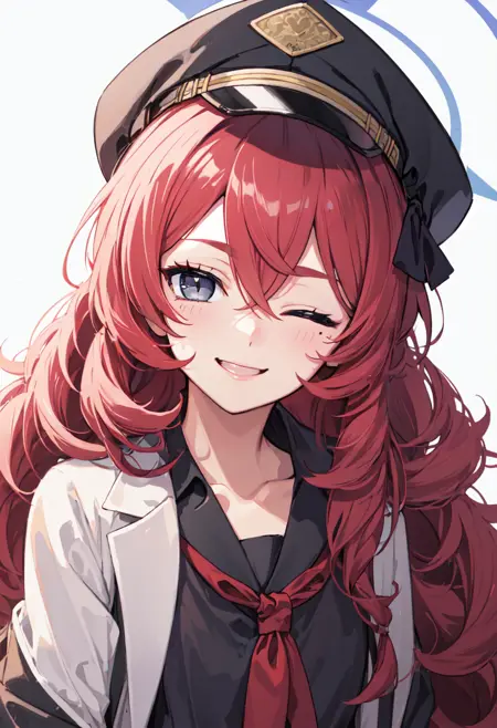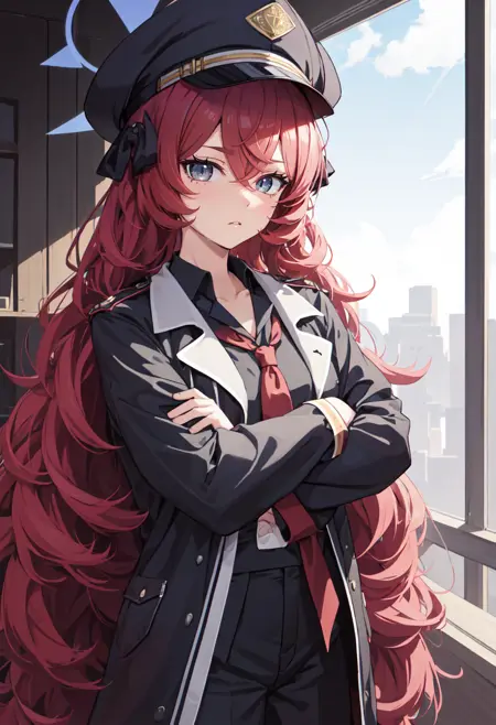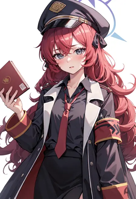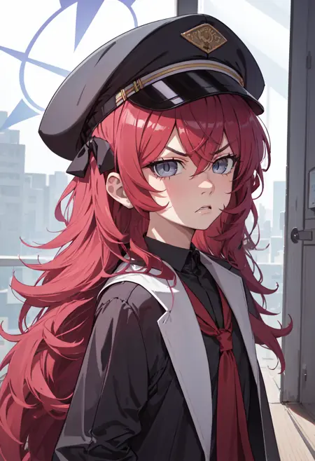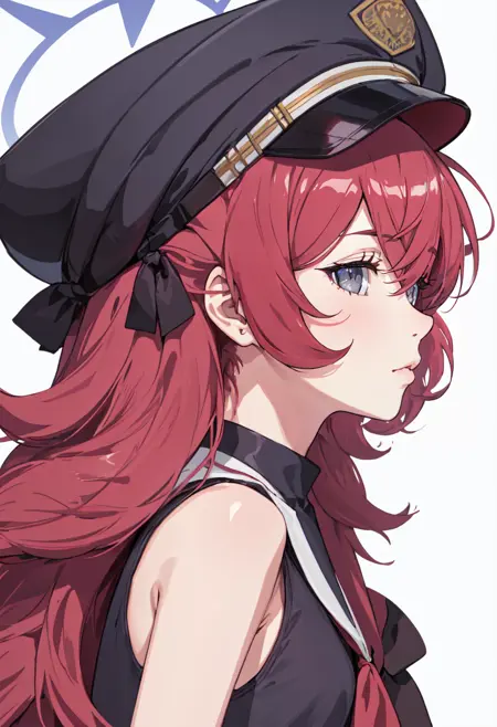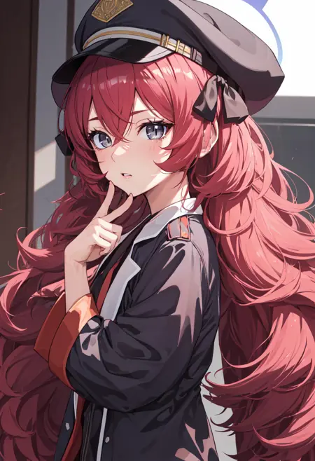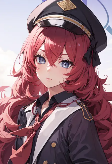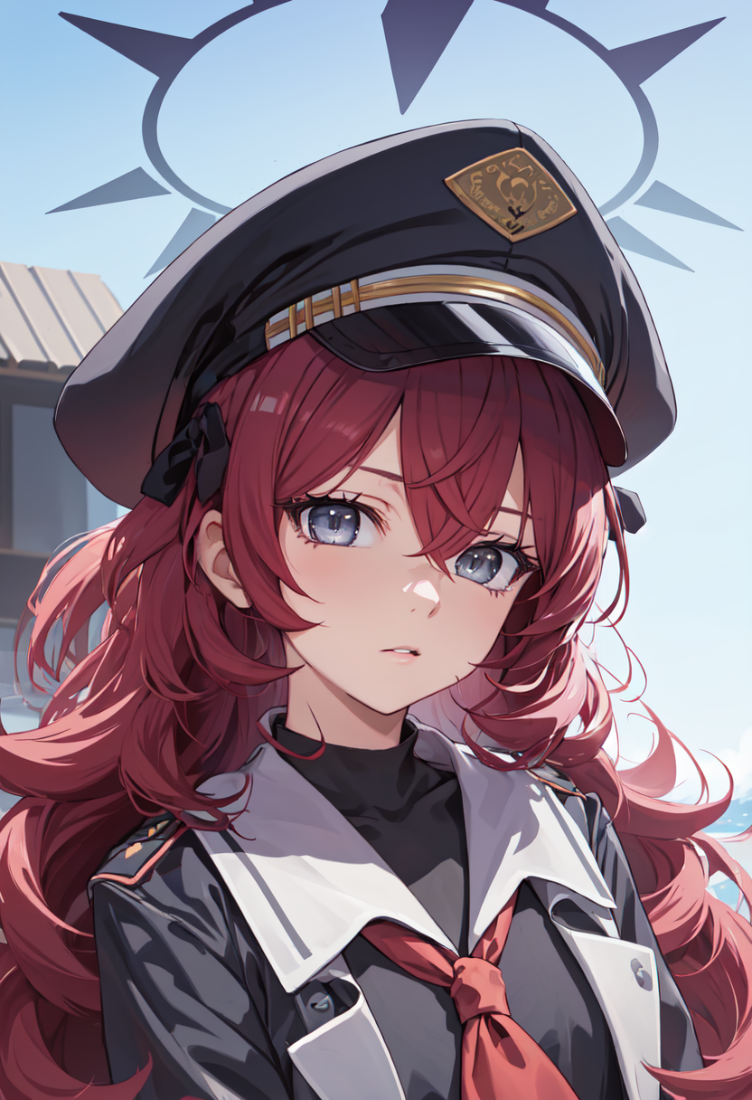触发词为 iroha_bluearchive,剪枝标签为 red_hair, long_hair, halo, grey_eyes, hair_between_eyes, hat, peaked_cap, black_headwear, very_long_hair, wavy_hair, military_hat。当某些特征(如发色)有时不够稳定时,您可以在提示词中加入这些标签。