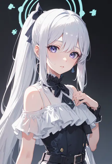 - 削減されたキャラクタータグは以下の通りです:長髪、紫眼、ハロー、灰色髪、白髪、青いハロー、リボン、ポニーテール、胸、髪のリボン、小胸。キャラクターの主な特徴(例:髪の色)が安定しない場合、これらのタグをプロンプトに追加してください。
