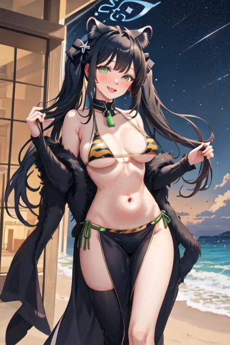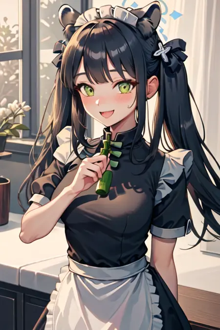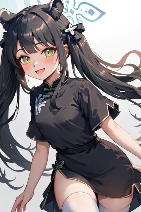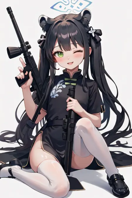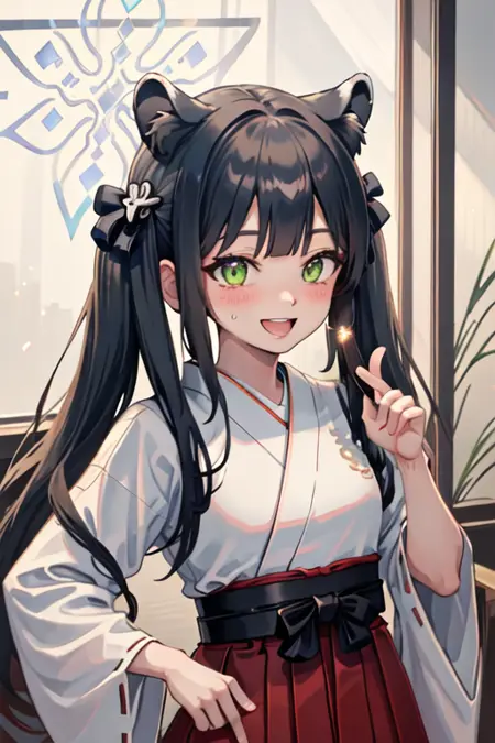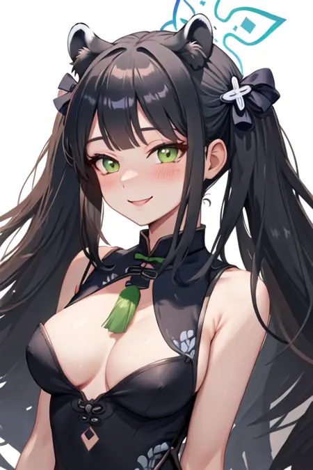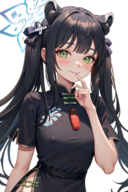 The trigger word is shun_bluearchive, and the pruned tags are black_hair, long_hair, animal_ears, green_eyes, tiger_ears, halo, animal_ear_fluff, twintails, breasts, tiger_girl, extra_ears. When some features (e.g. hair color) are not so stable at some times, you can add these them into your prompt.