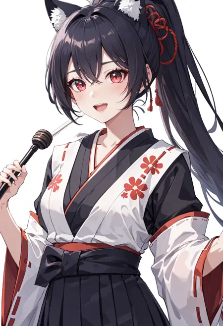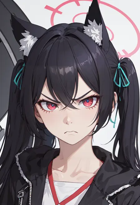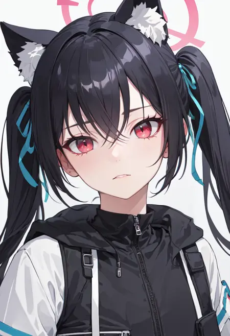 • The pruned character tags are animal ears, cat ears, black hair, animal ear fluff, long hair, halo, red eyes, twintails, ribbon, hair ribbon, very long hair, extra ears, breasts, hair between eyes. You can add them into prompts when core features (e.g. hair color) of character is not so stable.