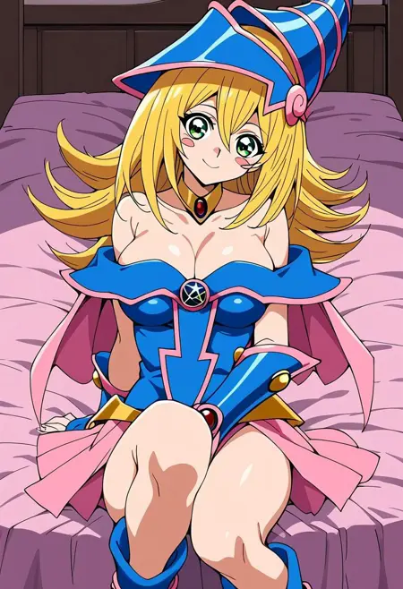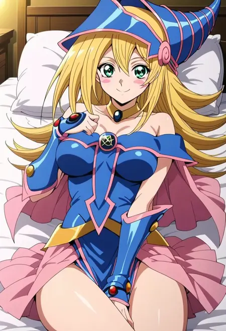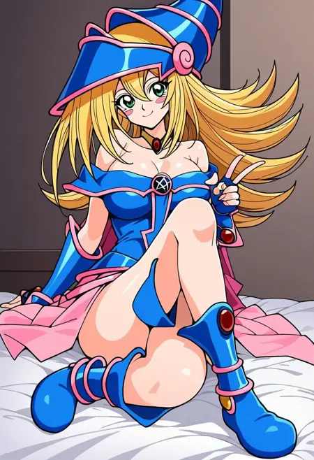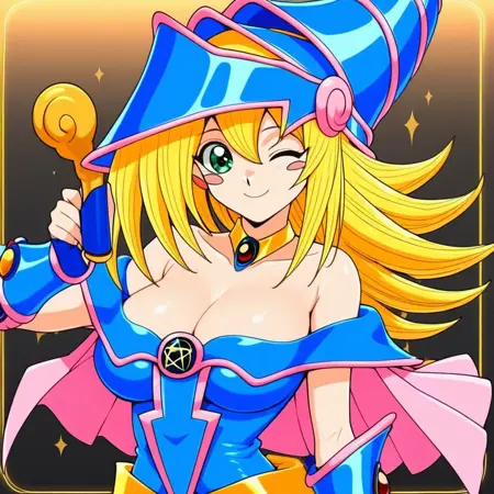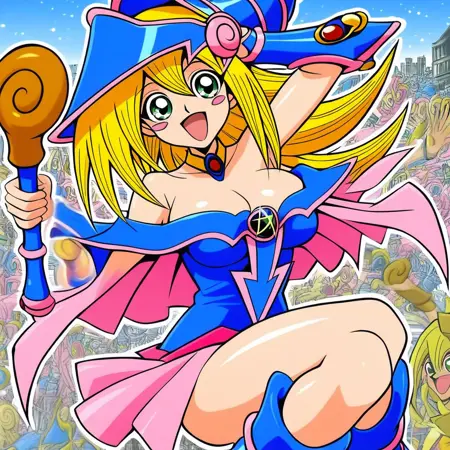 | 训练词汇 | Base: Dark Magician Girl, blonde hair, long hair, green eyes, large breasts, 已复制! Outfit: Blue hat, pointy hat, blue short cape, pink inner cape, blue corset, gold details, blue gloves,fingerless gloves, pink skirt, blue boots, knee-high boots, shoulders exposed, 已复制! |