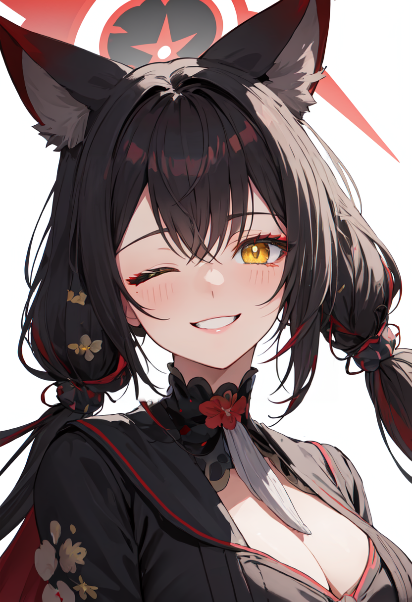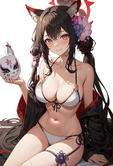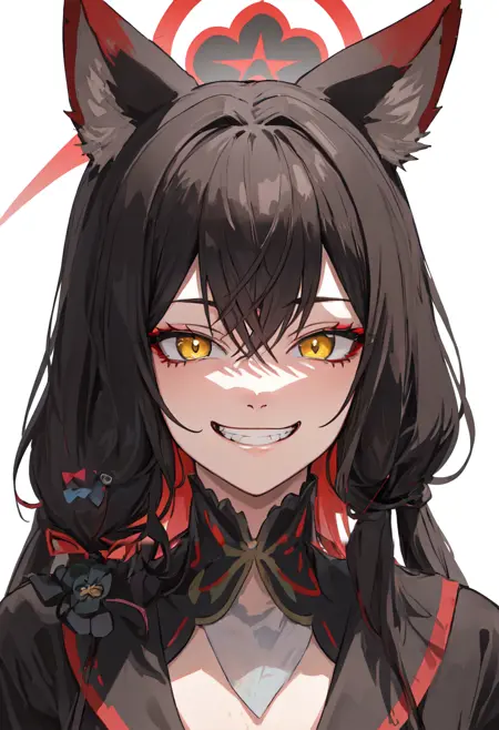 トリガーワードはwakamo_bluearchive、削除されたタグはfox_ears, animal_ears, long_hair, animal_ear_fluff, fox_girl, black_hair, yellow_eyes, halo, breasts, multicolored_hair, large_breasts, fox_tail, tail, hair_ornament, red_hair, hair_flower, colored_inner_hair, two-tone_hairです。ある特徴(例:髪の色)が安定しない場合、これらのタグをプロンプトに追加してください。