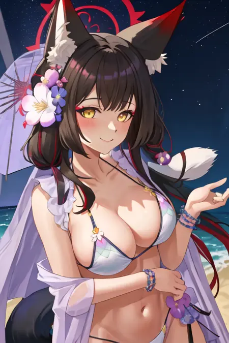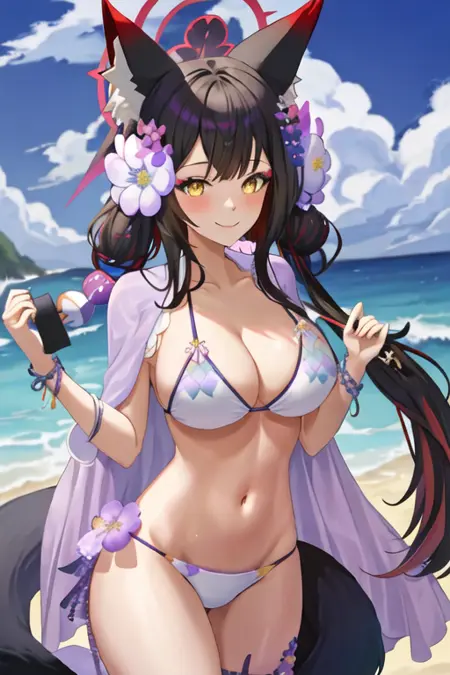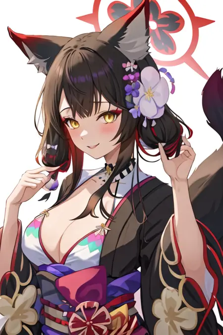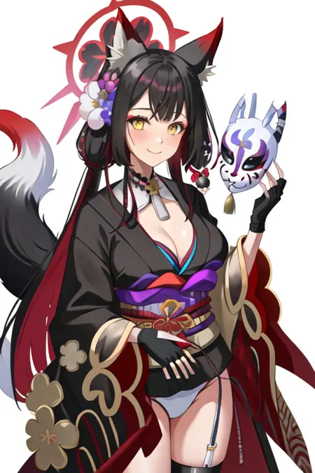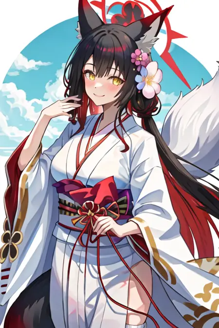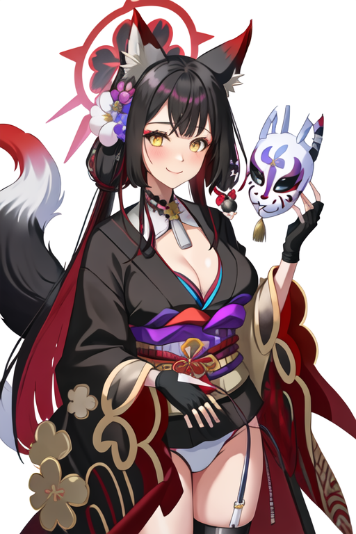 - The pruned character tags are fox ears, animal ears, long hair, animal ear fluff, fox girl, black hair, yellow eyes, halo, breasts, multicolored hair, large breasts, fox tail, tail, hair ornament, red hair, hair flower, colored inner hair, two-tone hair. You can add them into prompts when core features (e.g. hair color) of character is not so stable.