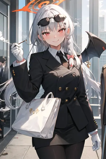 触发词为 haruna_bluearchive,剪枝标签为 grey_hair, red_eyes, braid, halo, long_hair, wings, breasts, single_wing, side_braid, large_breasts, demon_wings, tail, red_halo, black_wings, eyewear_on_head。当某些特征(例如发色)有时不够稳定时,您可以将这些标签添加到您的提示词中。