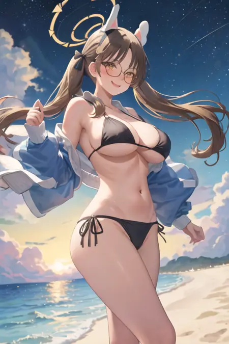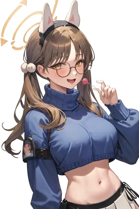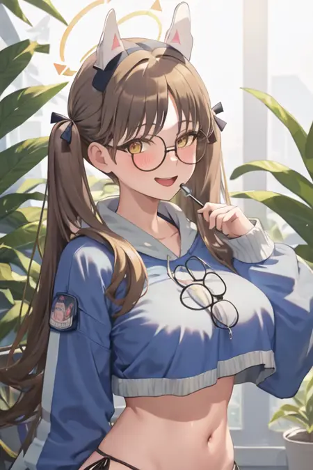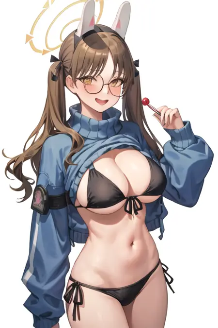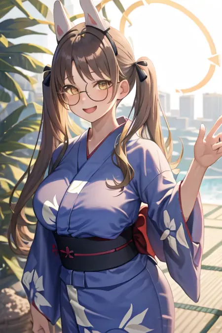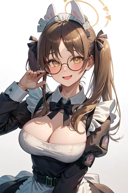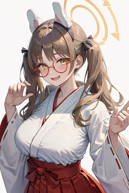 The trigger word is moe_bluearchive, and the pruned tags are brown_hair, twintails, long_hair, halo, breasts, yellow_eyes, large_breasts, glasses, animal_ears, fake_animal_ears, rabbit_ears, round_eyewear, hair_ornament. When some features (e.g. hair color) are not so stable at some times, you can add these them into your prompt.