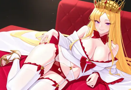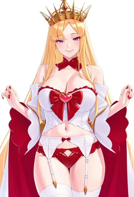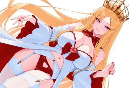 2단계 업그레이드: europafstage2, 왕관, 흰 드레스, 란제리, 프릴, 긴 소매, 넓은 소매, 젖은 가슴, 벗겨진 어깨, 하트 브로치, 빨간 리본, 배꼽, 보석, 분리된 칼라, 빨간 칼라, 속옷, 빨간 팬티, 흰 허벅지 긴 양말, 스트랩, 기터 벨트.
