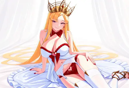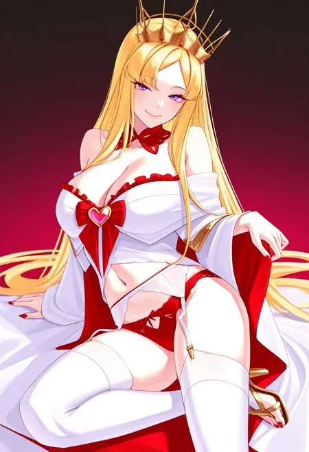 Second Ascension: europafstage2, crown, white dress, lingerie, frills, long sleeves, wide sleeves, cleavage, bare shoulders, heart brooch, red bow, navel, jewelry, detached collar, red collar, underwear, red panties, white thighhighs, garter straps, garter belt.