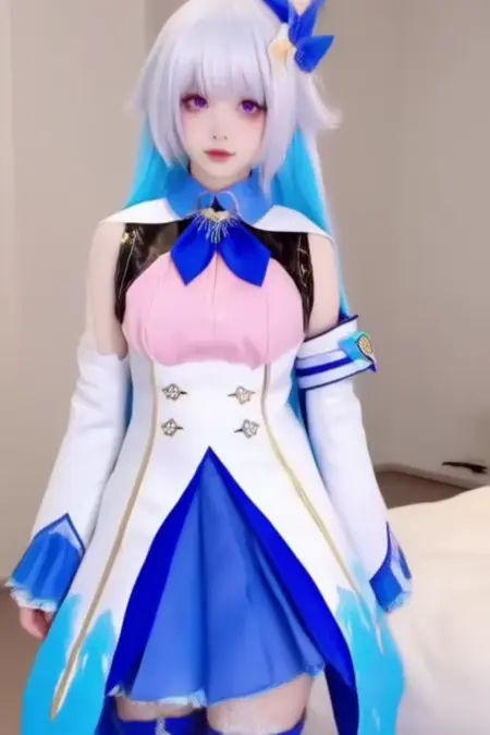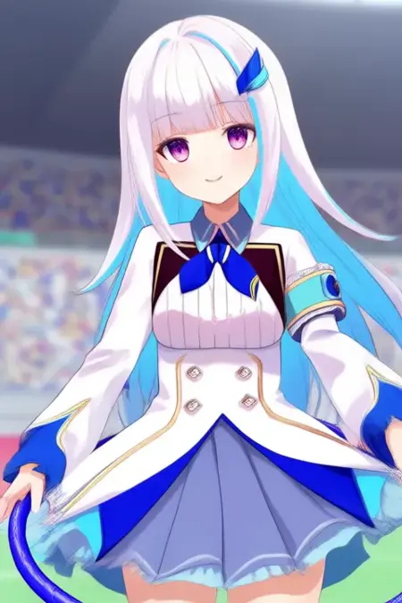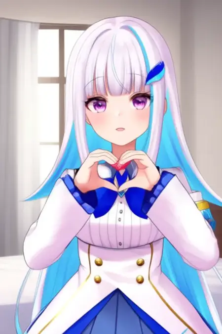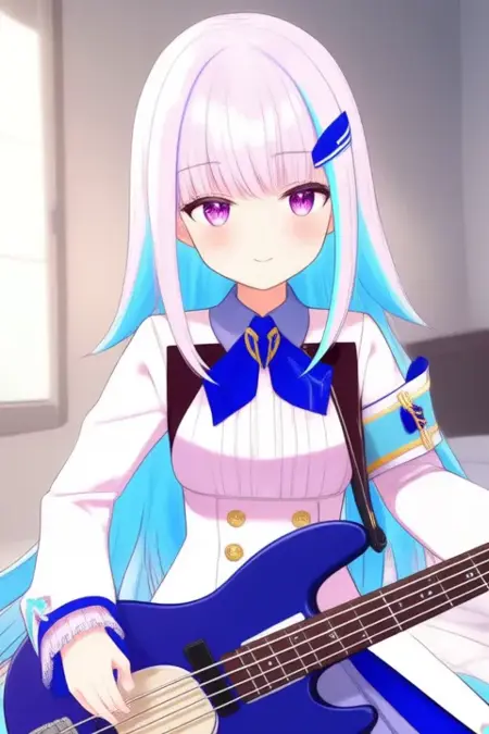 트리거 단어: Lize Helesta, 애니메이션 스타일 소녀. 이미지는 길고 곧은 흰색 머리카락에 측면에 파란색 줄무늬가 있는 애니메이션 스타일 캐릭터를 특징으로 합니다. 캐릭터의 눈은 크고 보라색이며 인상적인 외모를 자랑합니다. 캐릭터는 파란색 액센트가 있는 흰색 드레스를 입고 있습니다. 드레스는 높은 칼라에 앞부분에 큰 파란색 bow가 있으며, 소매도 파란색이고 흰색 커프스가 있습니다. 옷차림은 금색 단추가 달린 분홍색 블라우스와 매칭되는 스커트로 구성되어 있습니다.